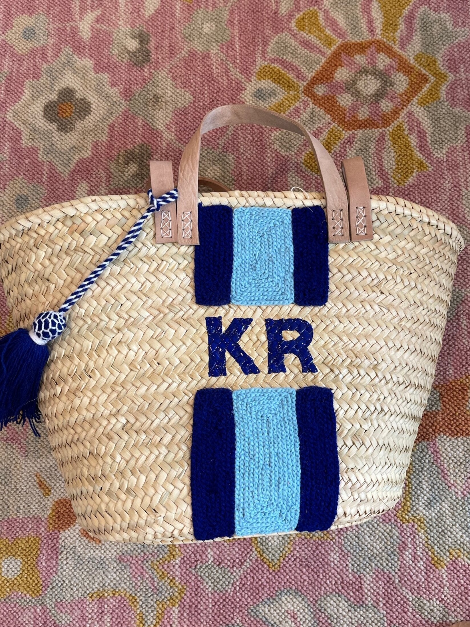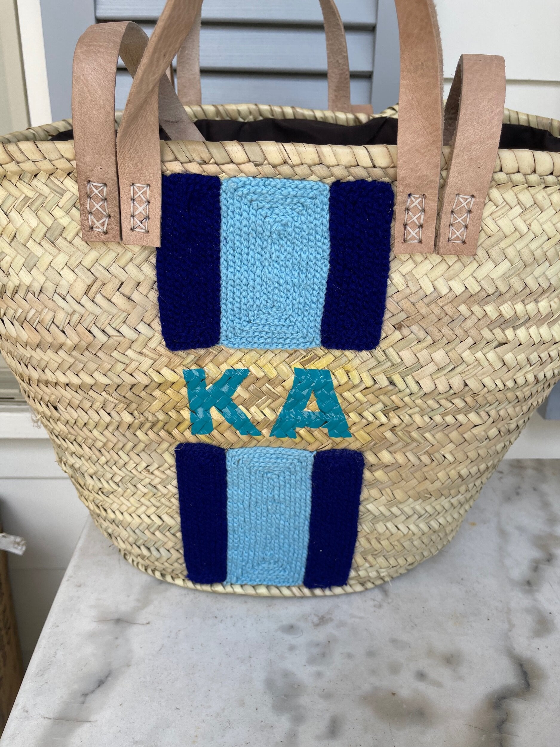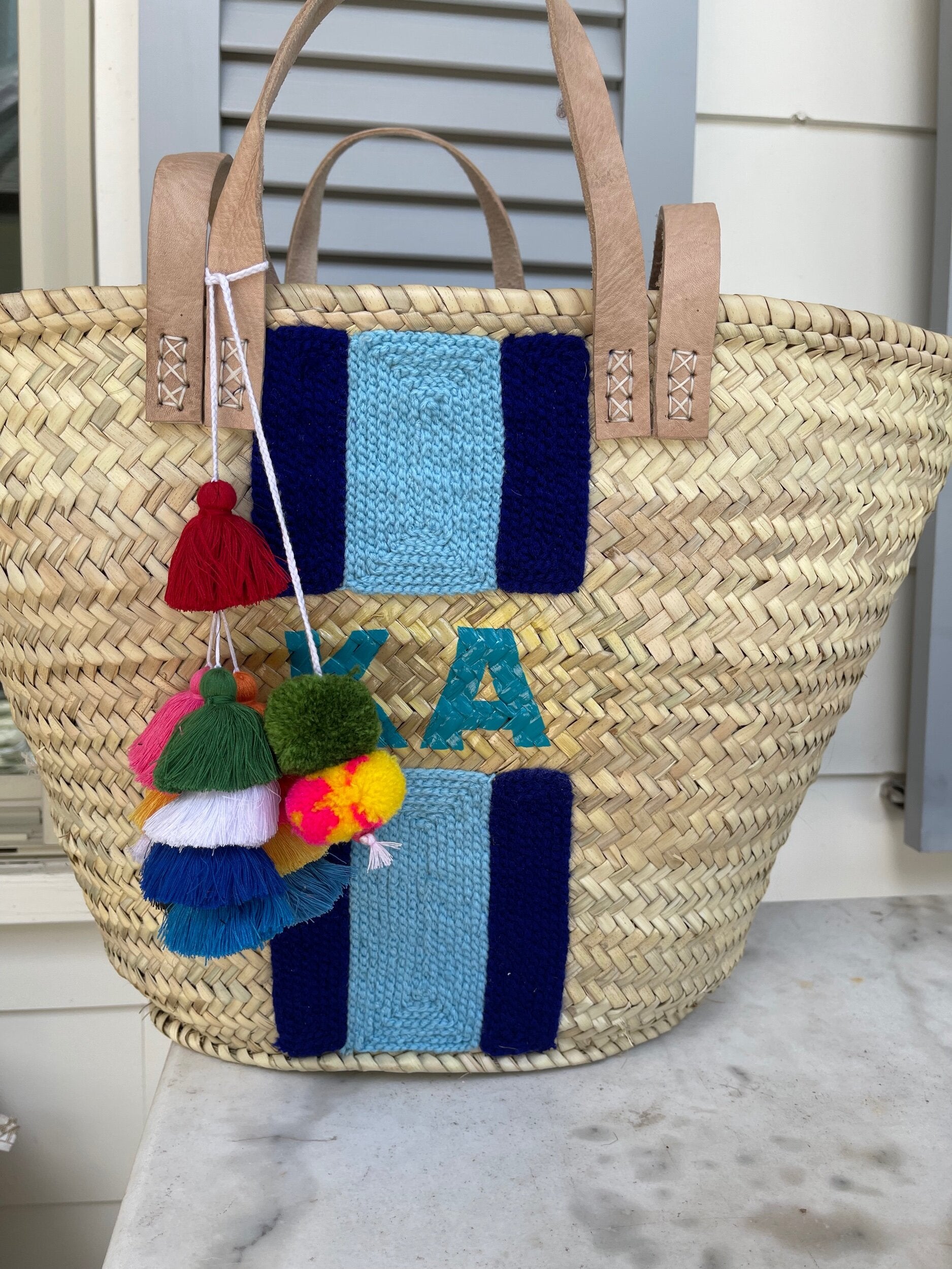 This style features hand embroidered stripes with light pink and white thread OR navy blue & light blue with initials painted inside.