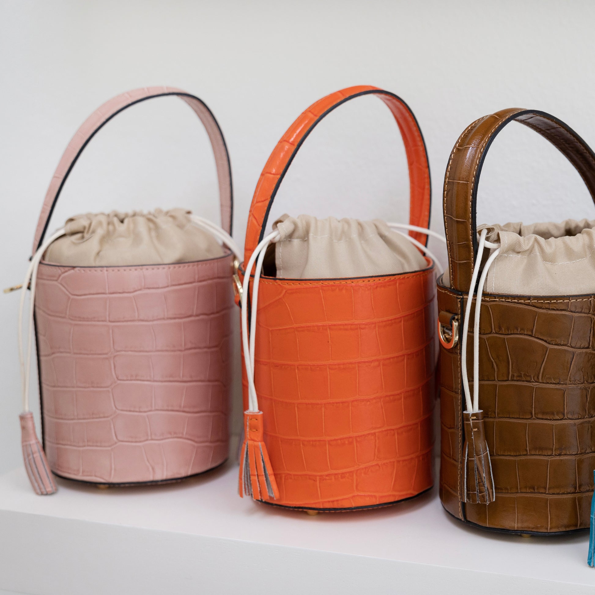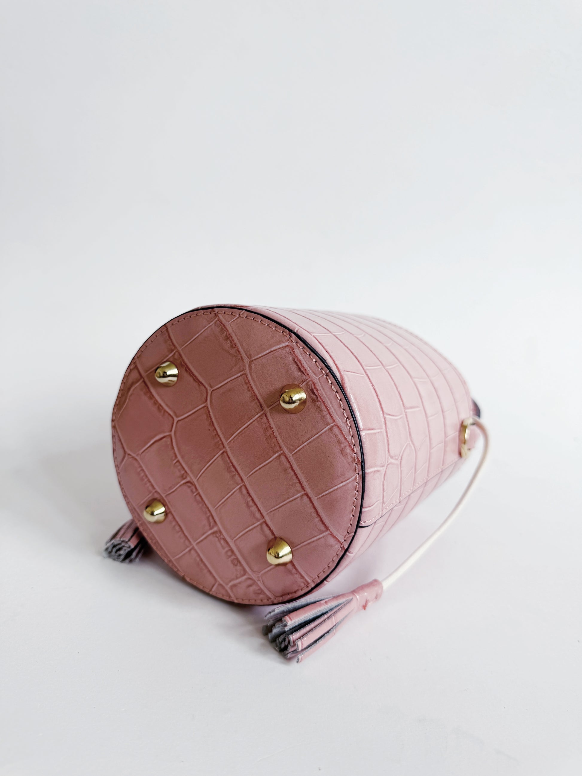 Light Pink Crocodile Embossed Leather Bucket Bag