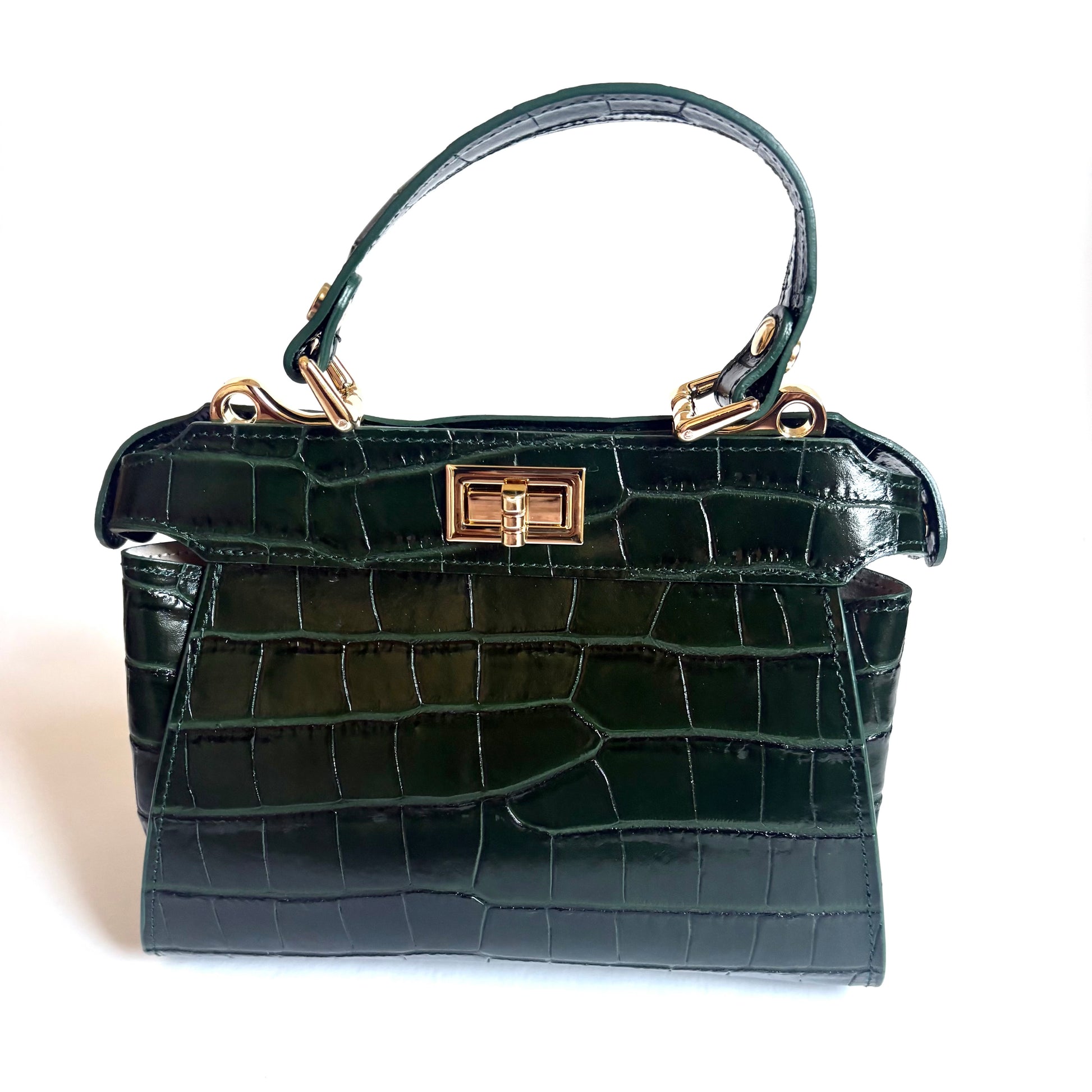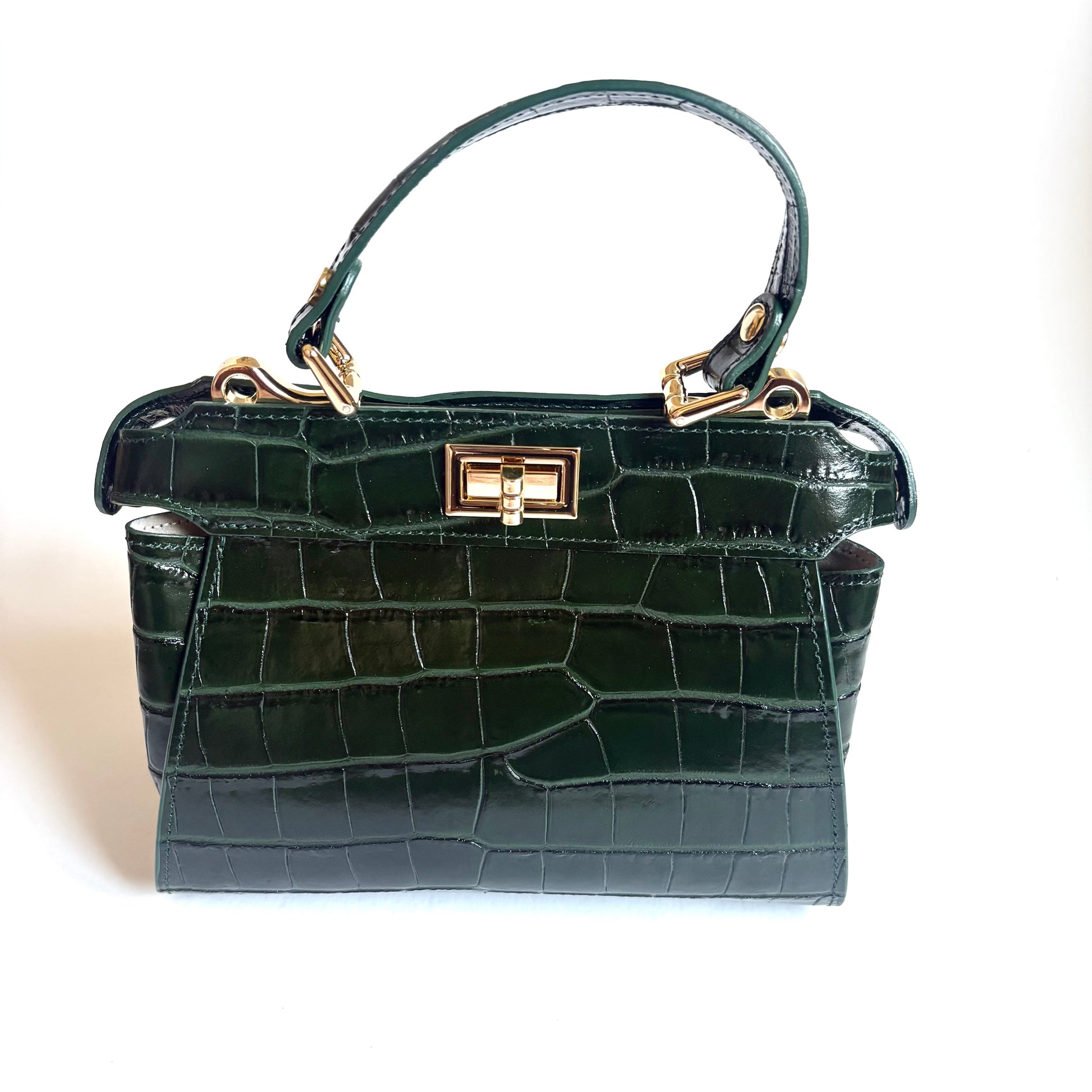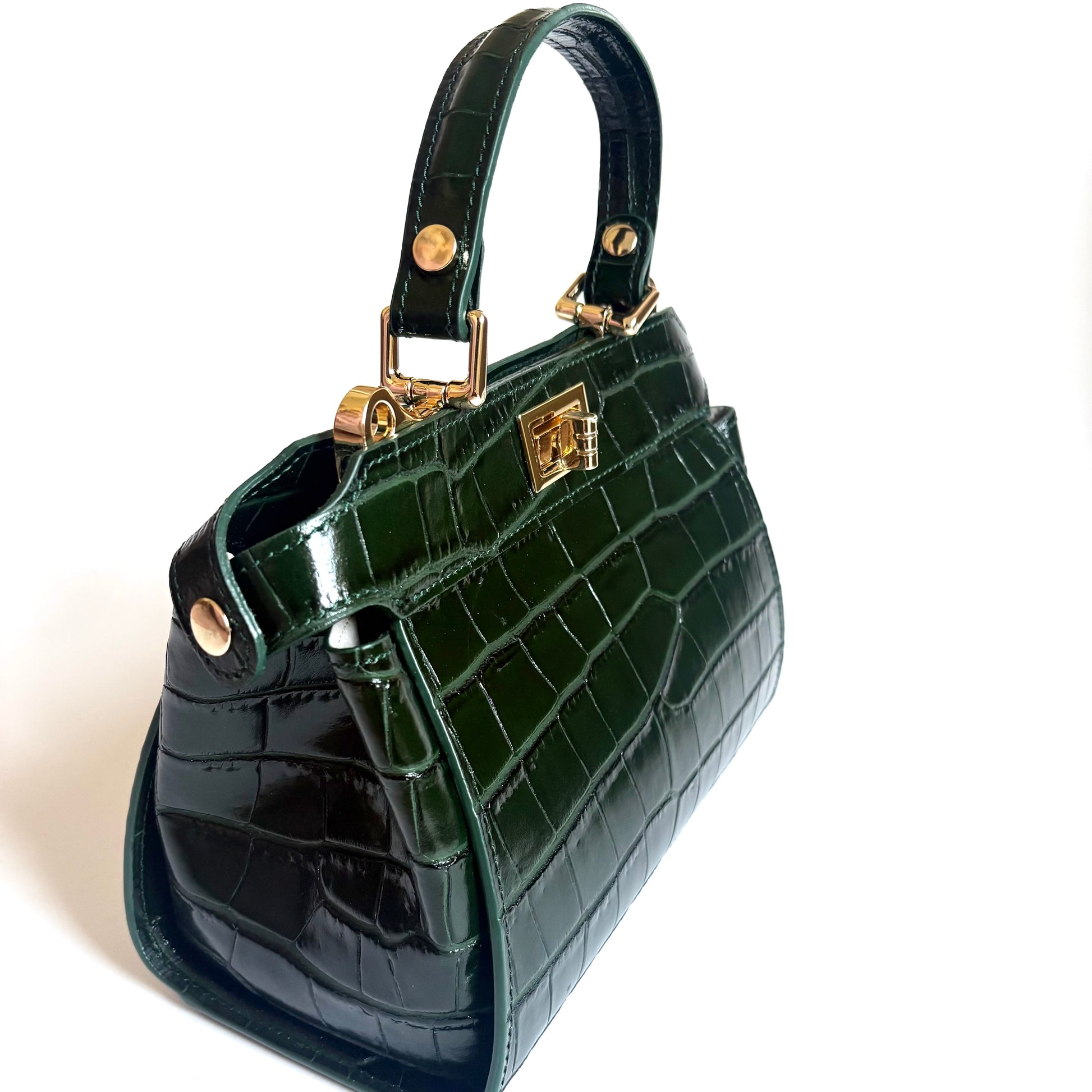 Dark Green Croc Embossed Leather Flip Lock Bag