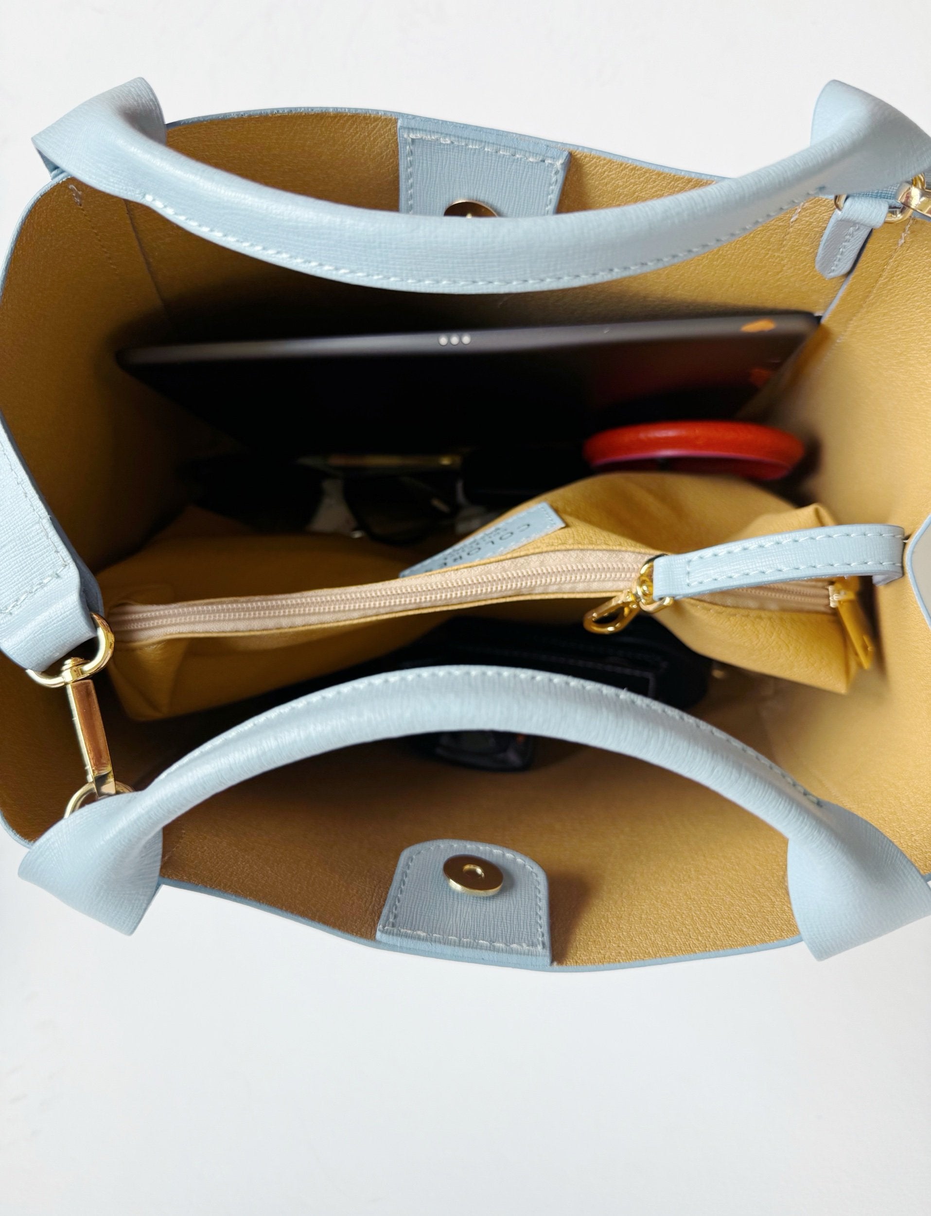 Optional interior clasps are attached to both sides of the bag that can be used to change the overall shape/ width of the opening.