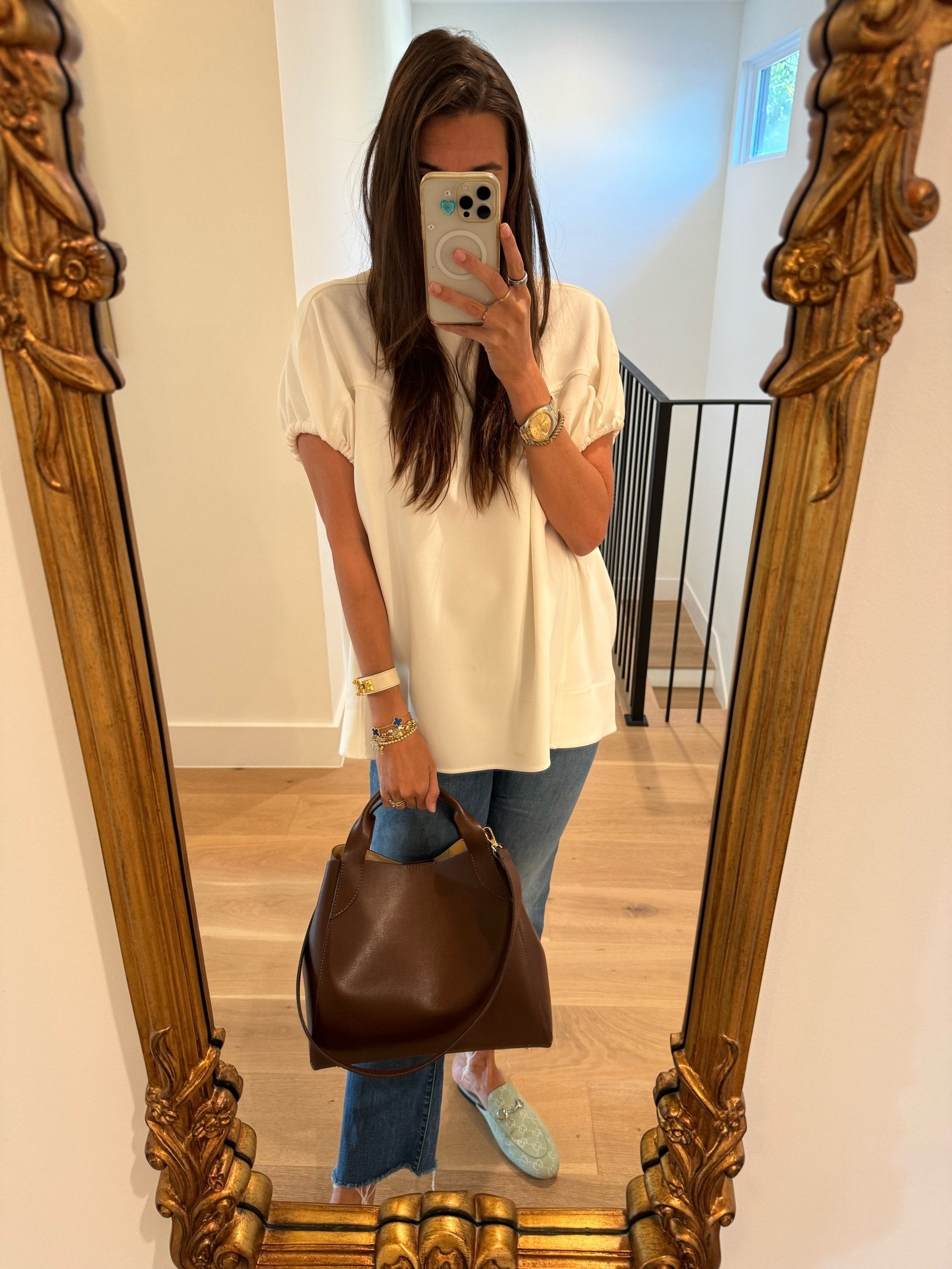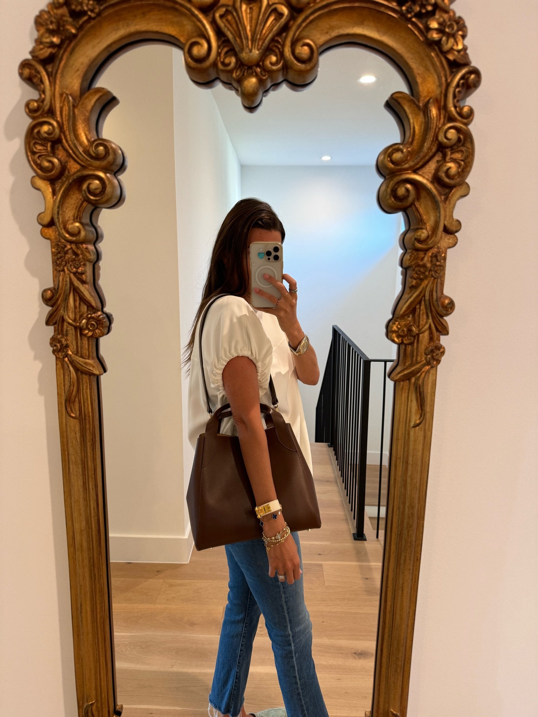 Detachable long leather strap that can be worn over the shoulder or crossbody depending on which of the rings/ clasps you attach it to.