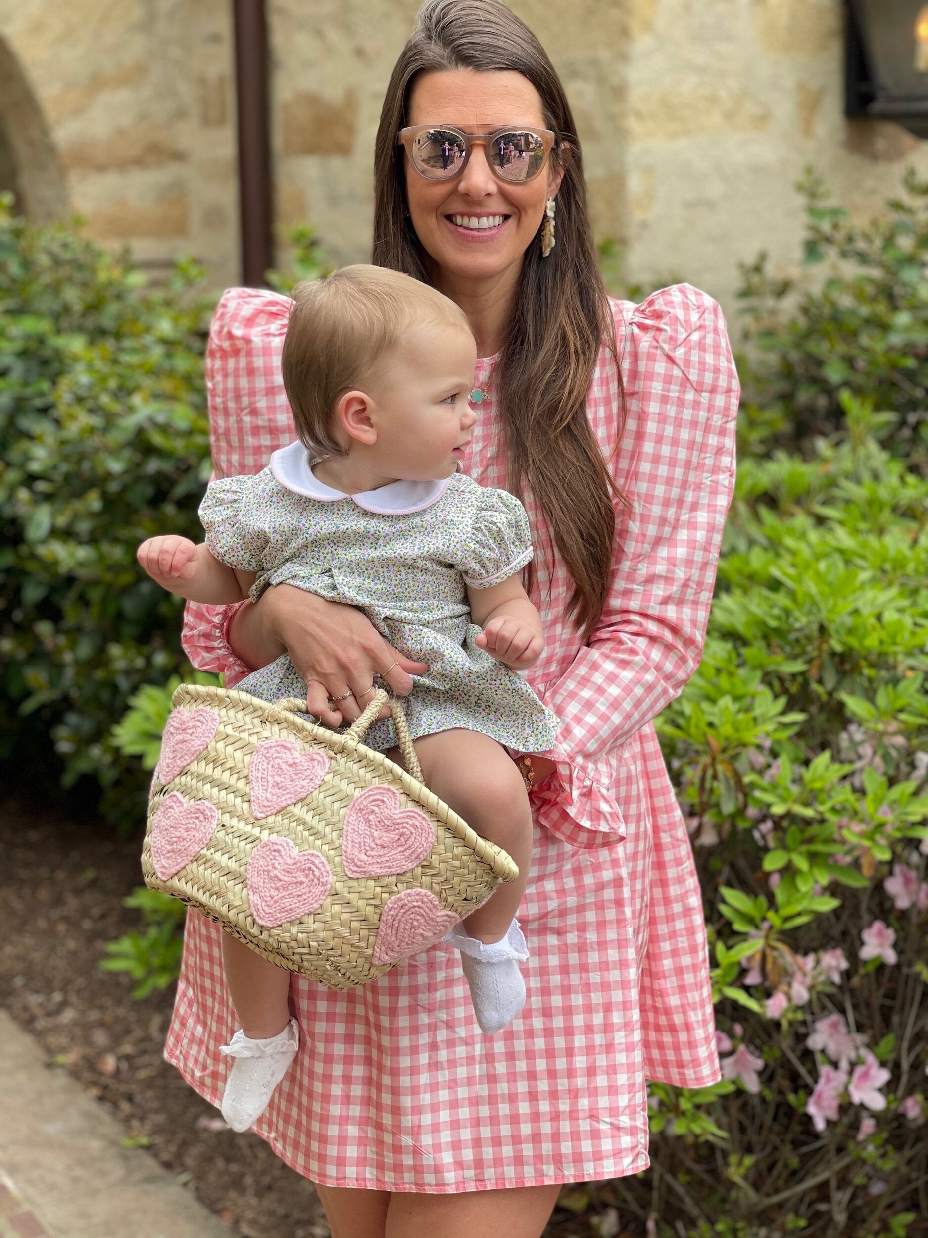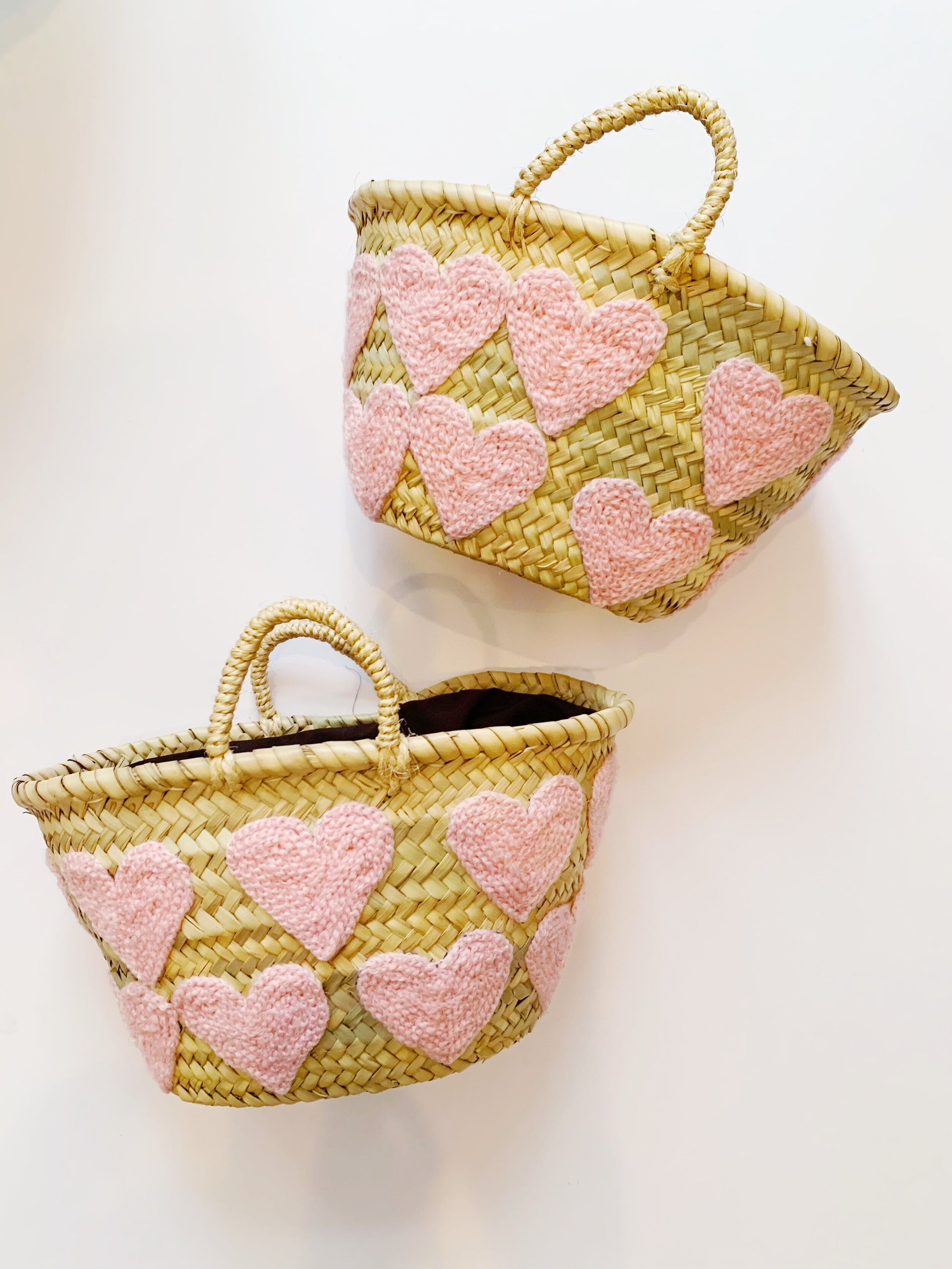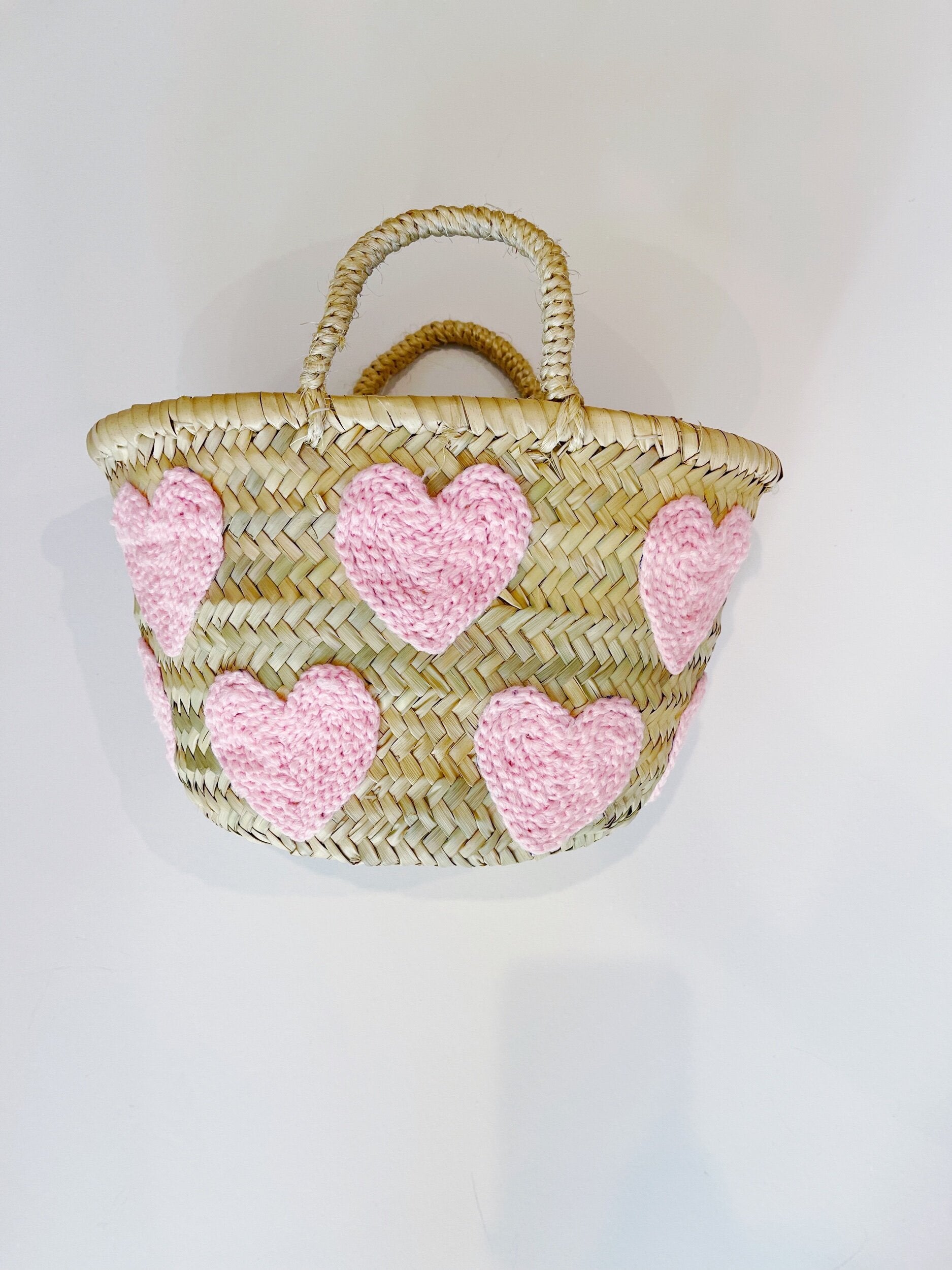 Sweet and chic mini light pink heart basket with hand embroidered thread. Design wraps around the entire bag.