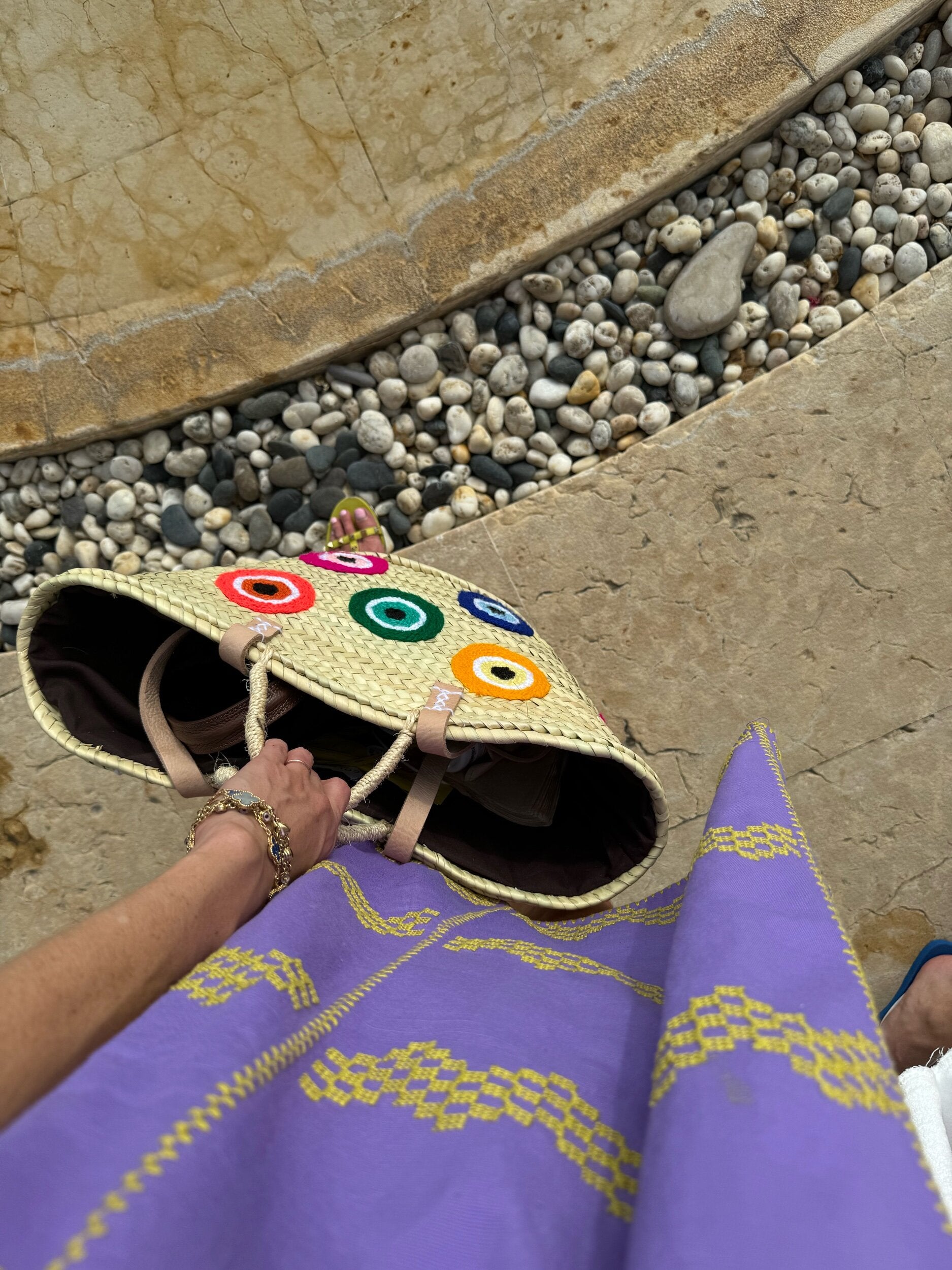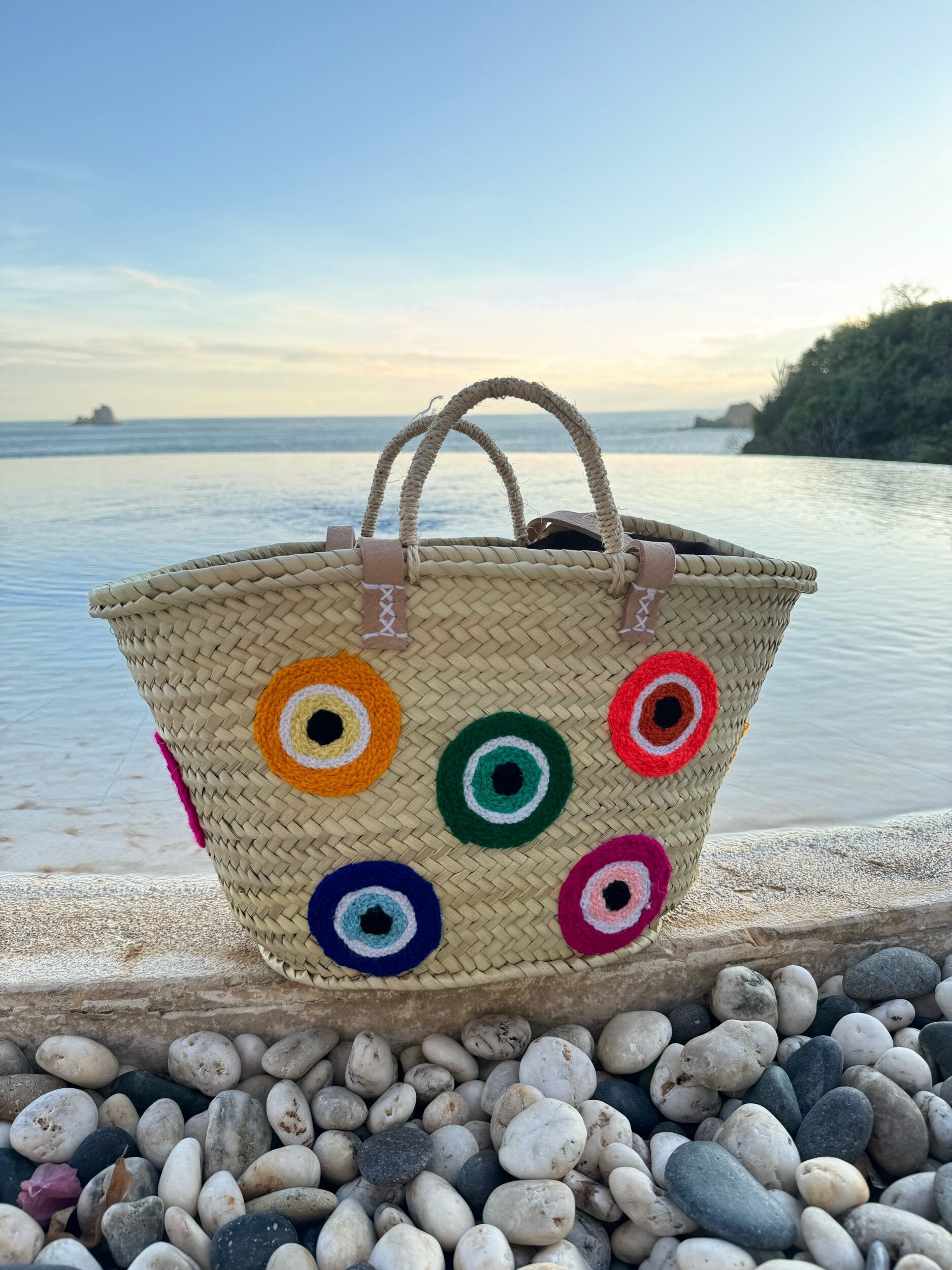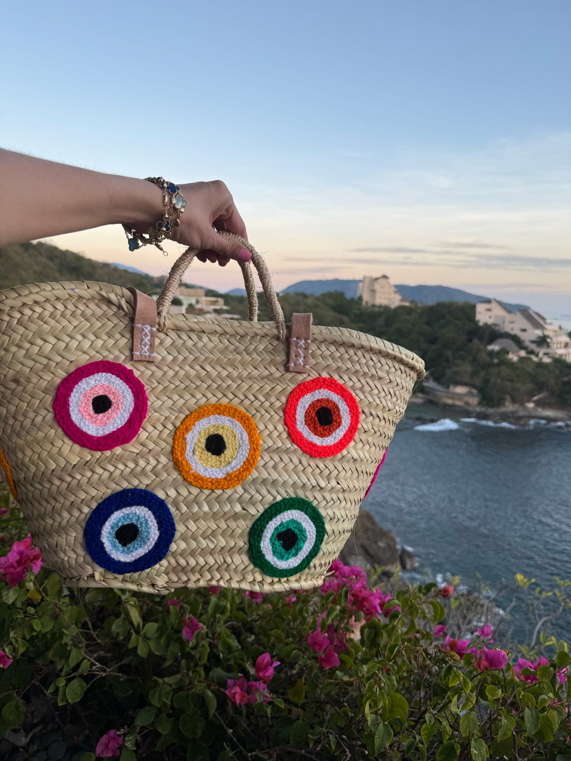 A variety of colored evil eyes encompass the entire bag for a unique design that goes with any outfit in any location.