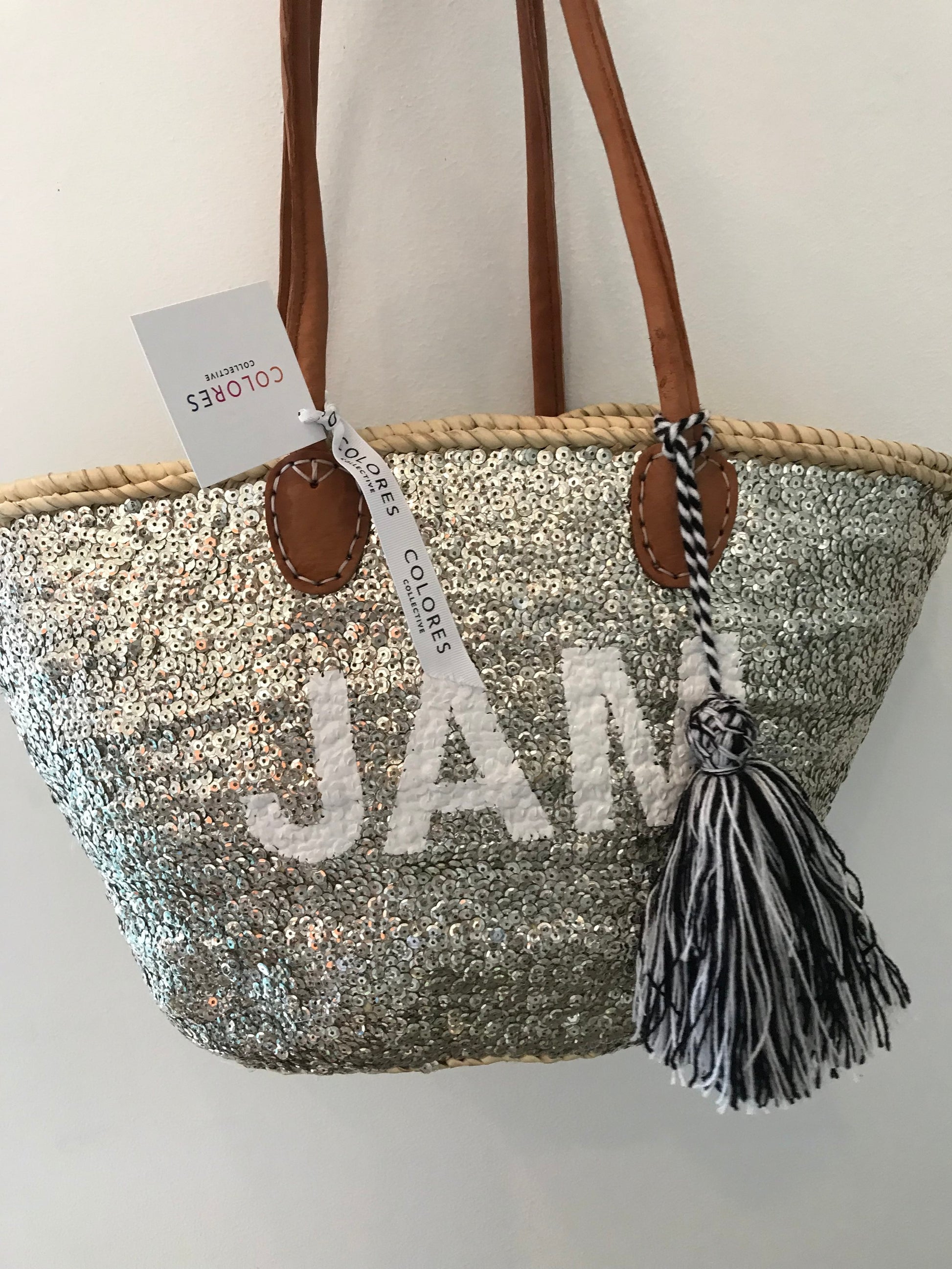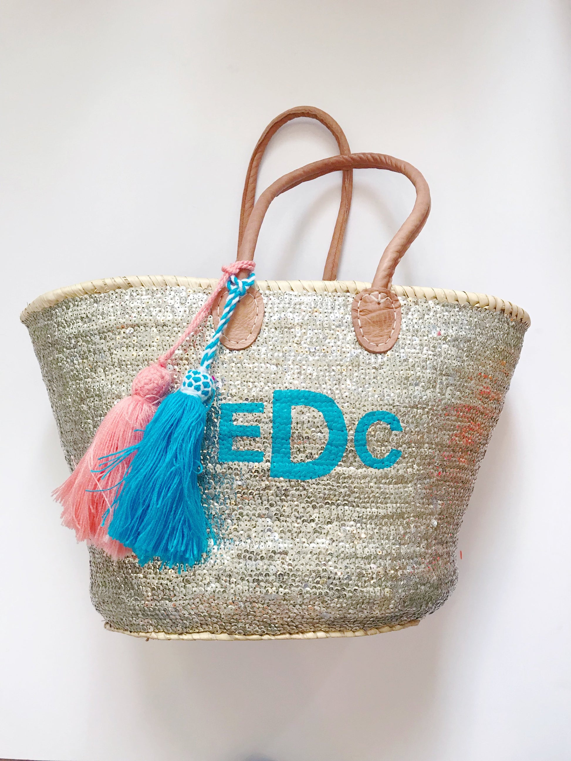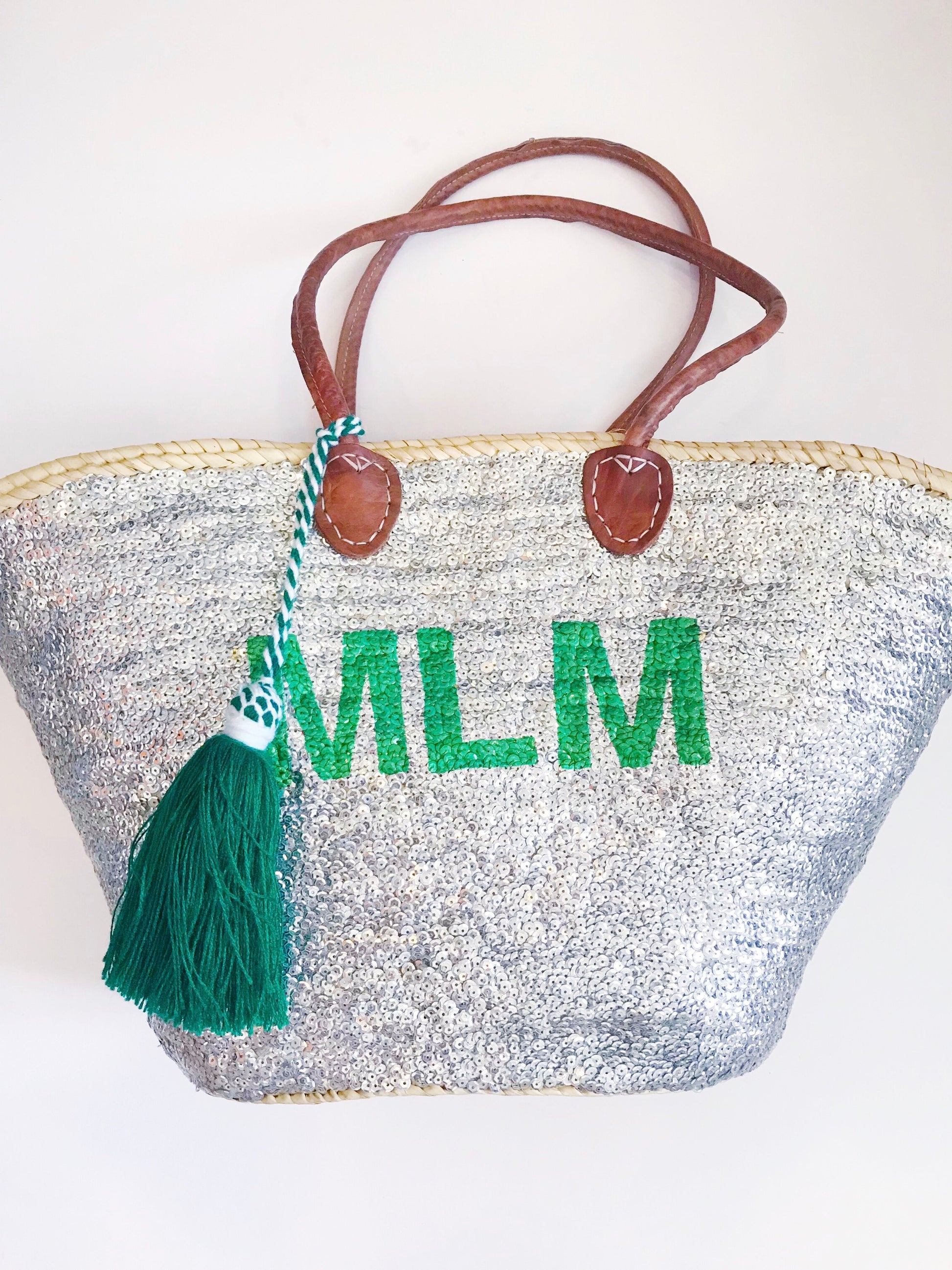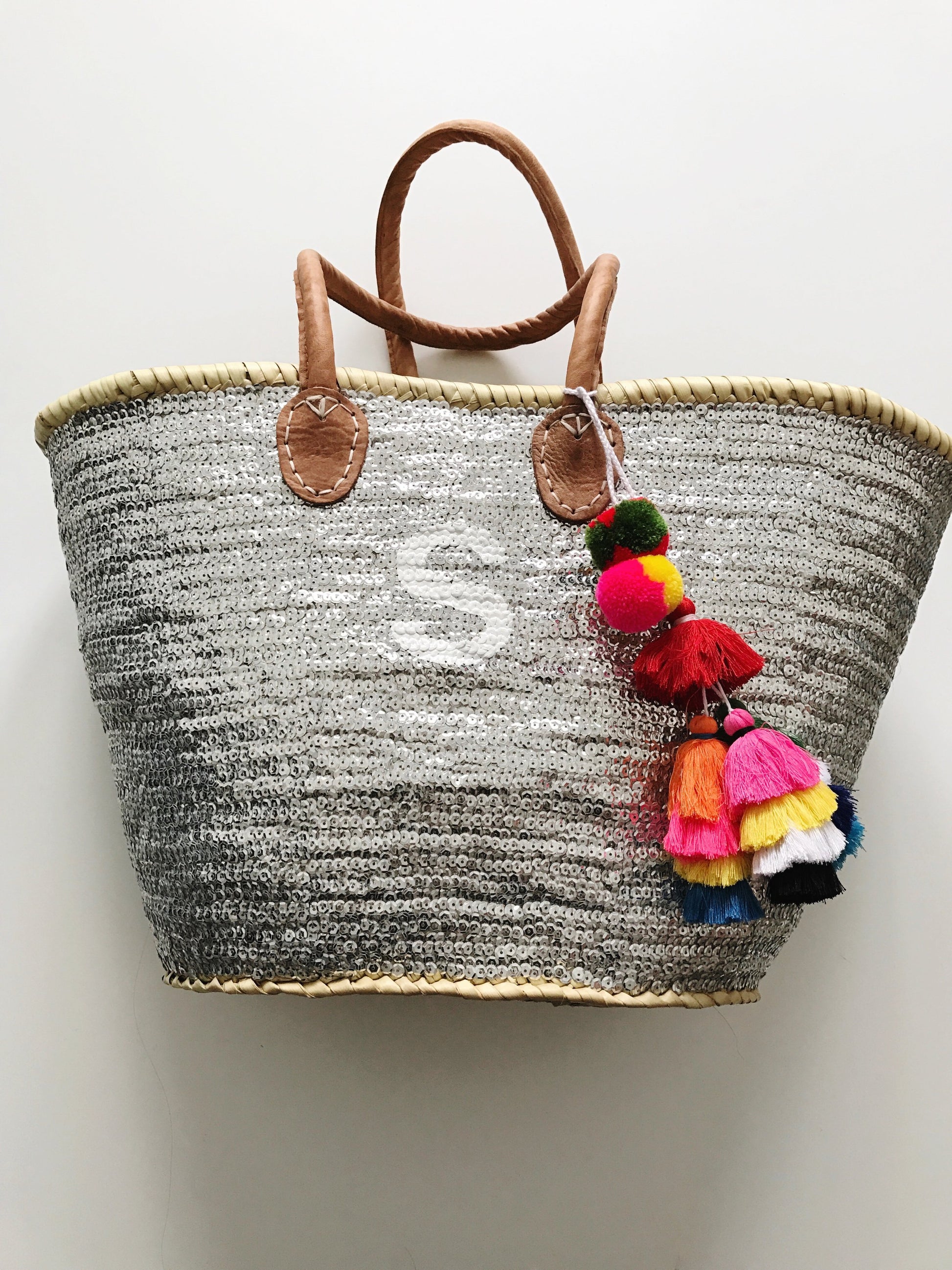 Handwoven straw totes from Morocco. Each bag covered in sequins that are individually sewn into the bag so they are secure. Medium length extra study light colored leather straps make for easy shoulder carrying.
