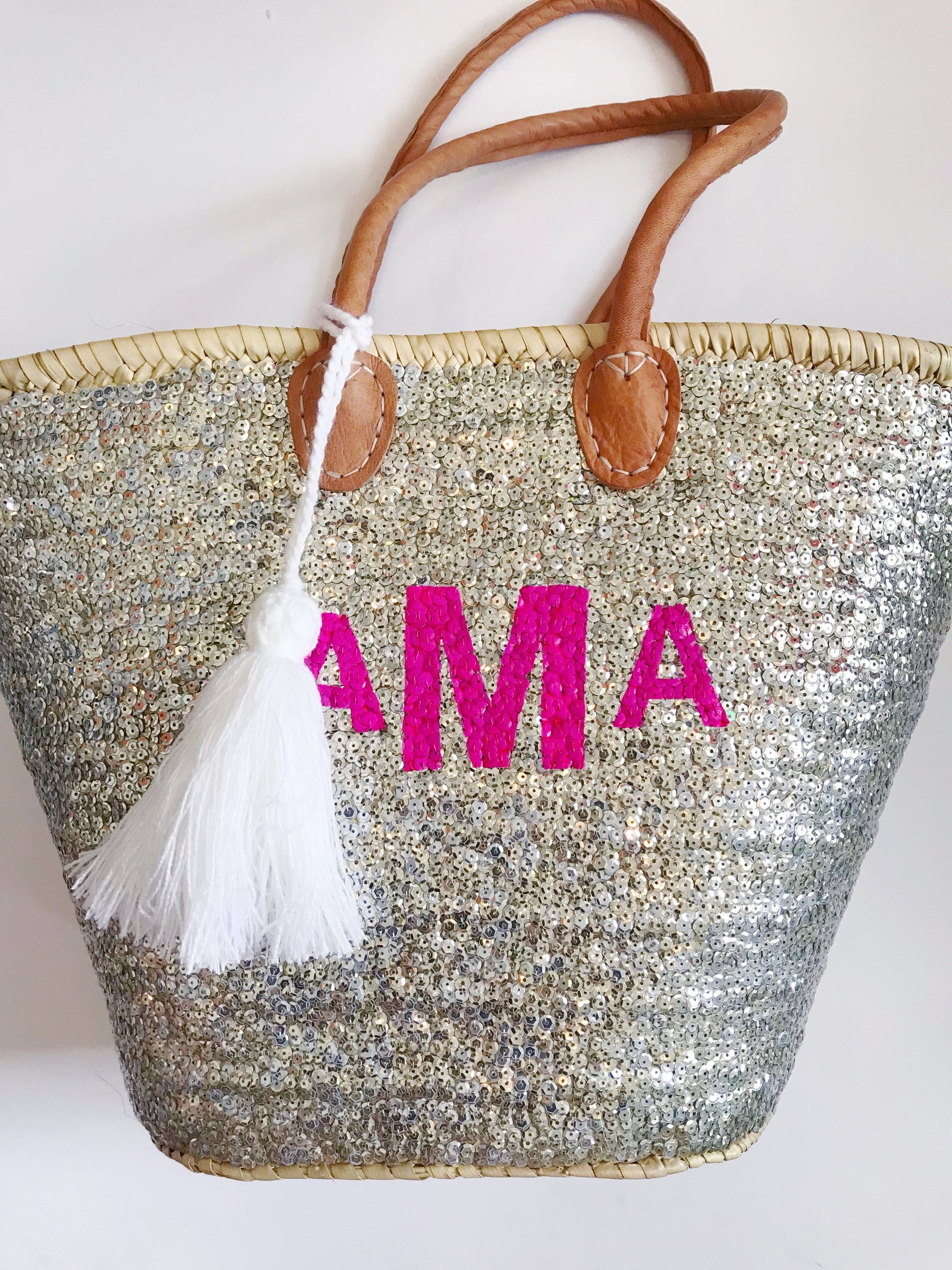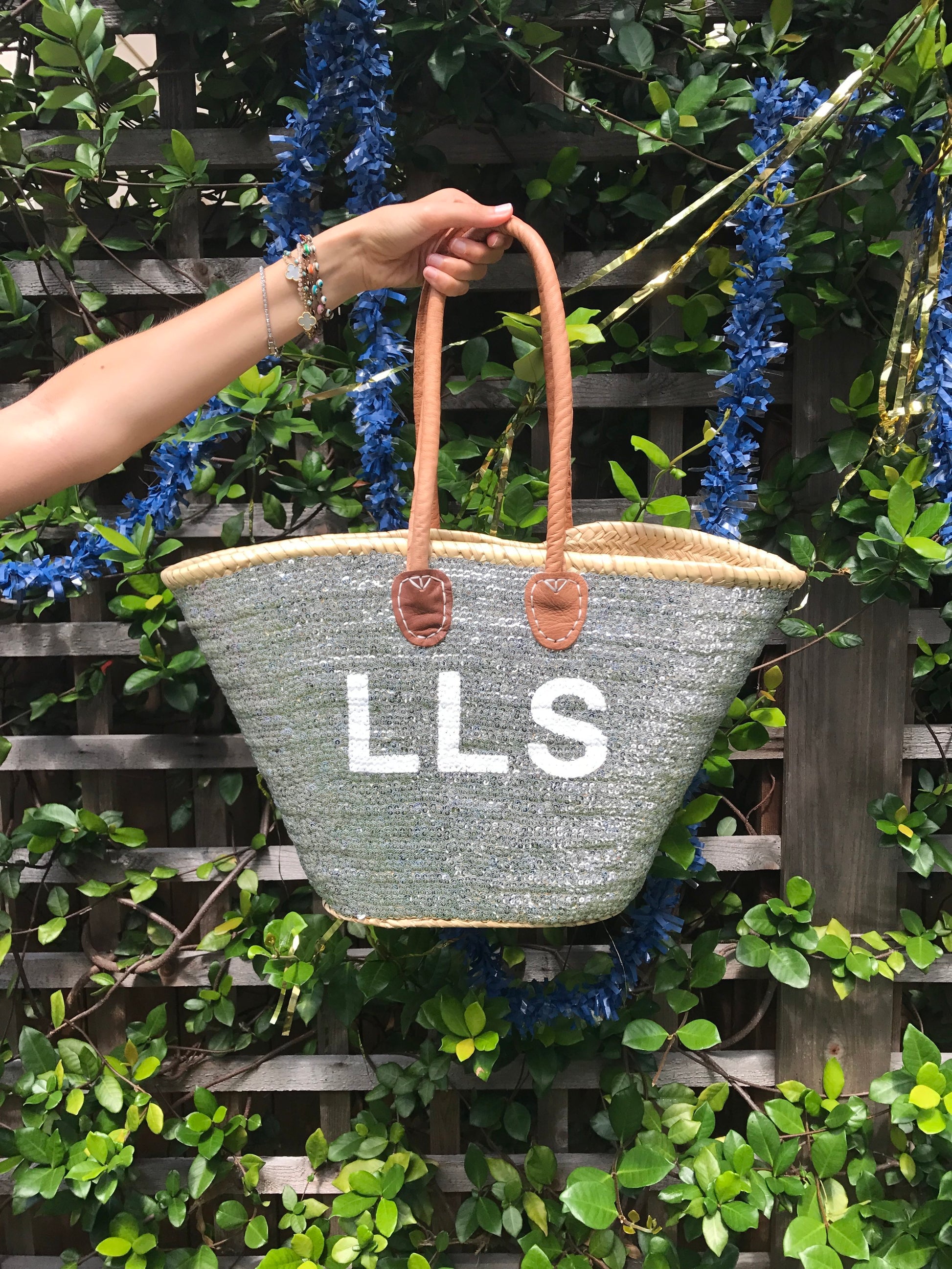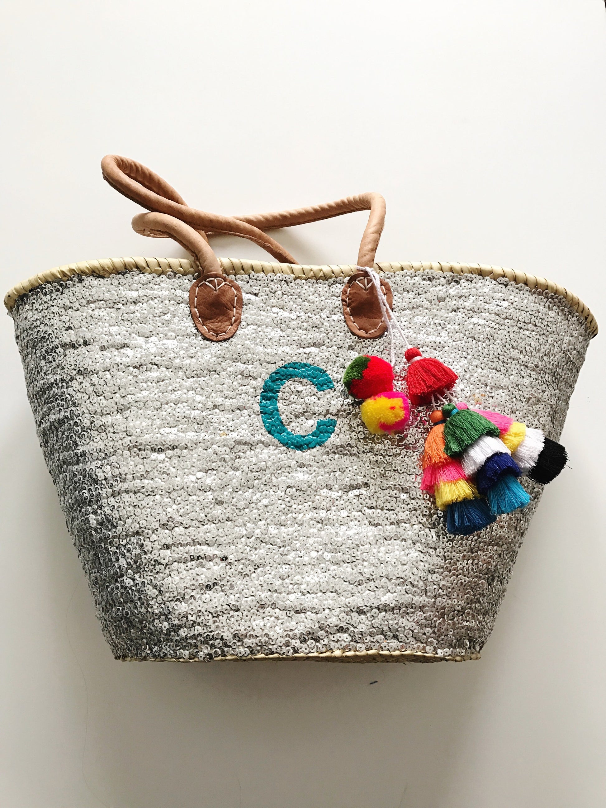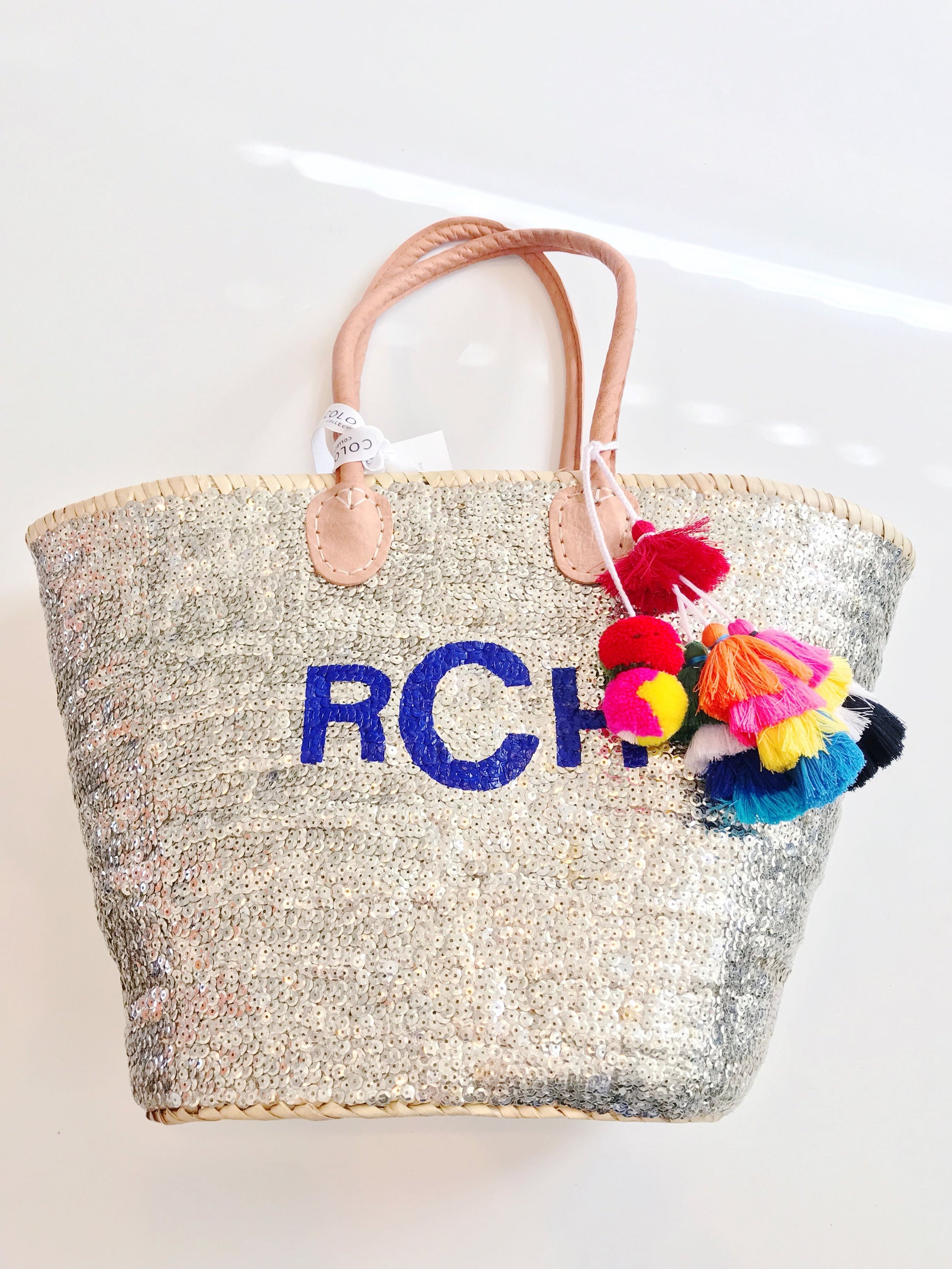 Handwoven straw totes from Morocco. Each bag covered in sequins that are individually sewn into the bag so they are secure. Medium length extra study light colored leather straps make for easy shoulder carrying.