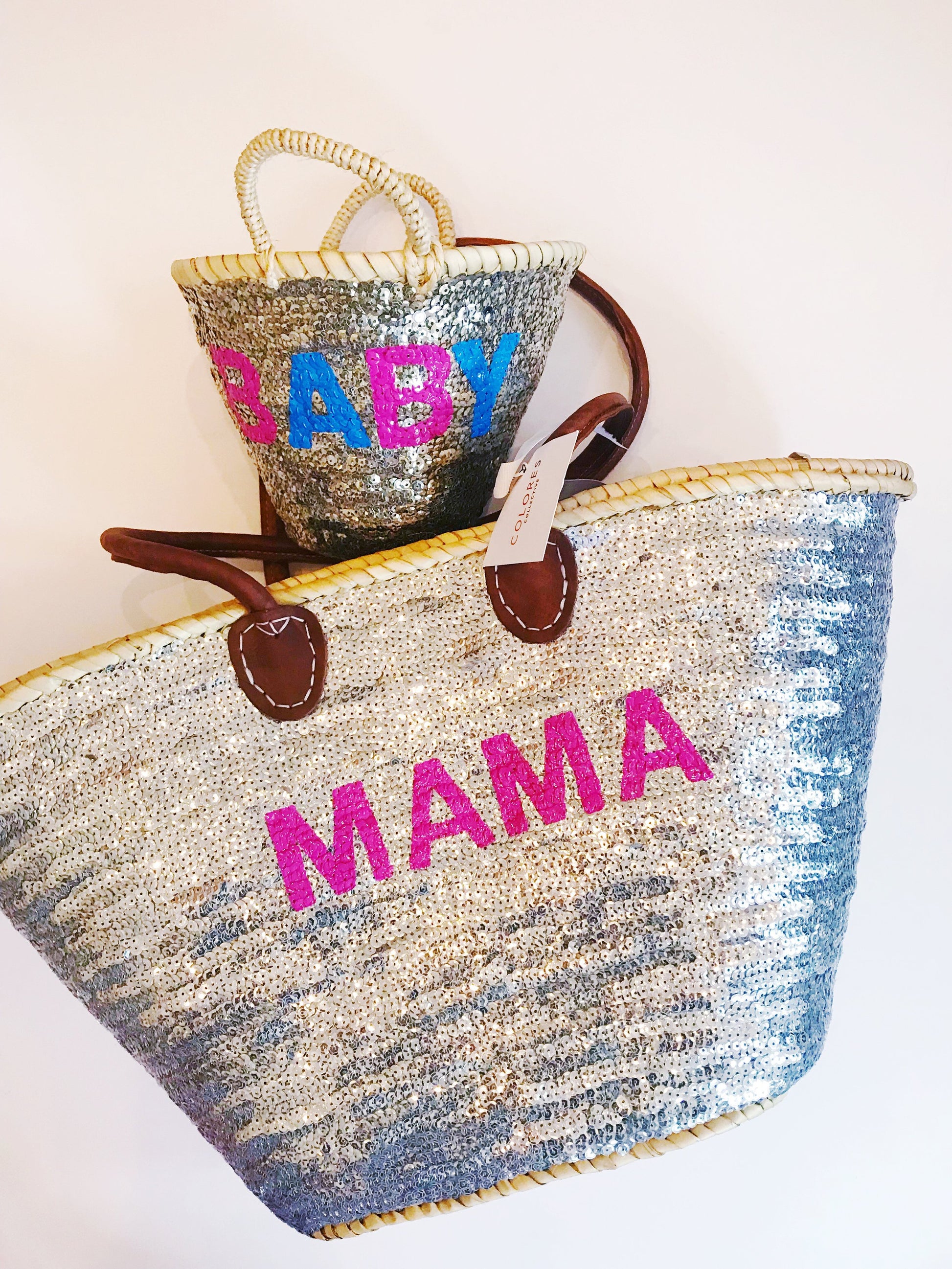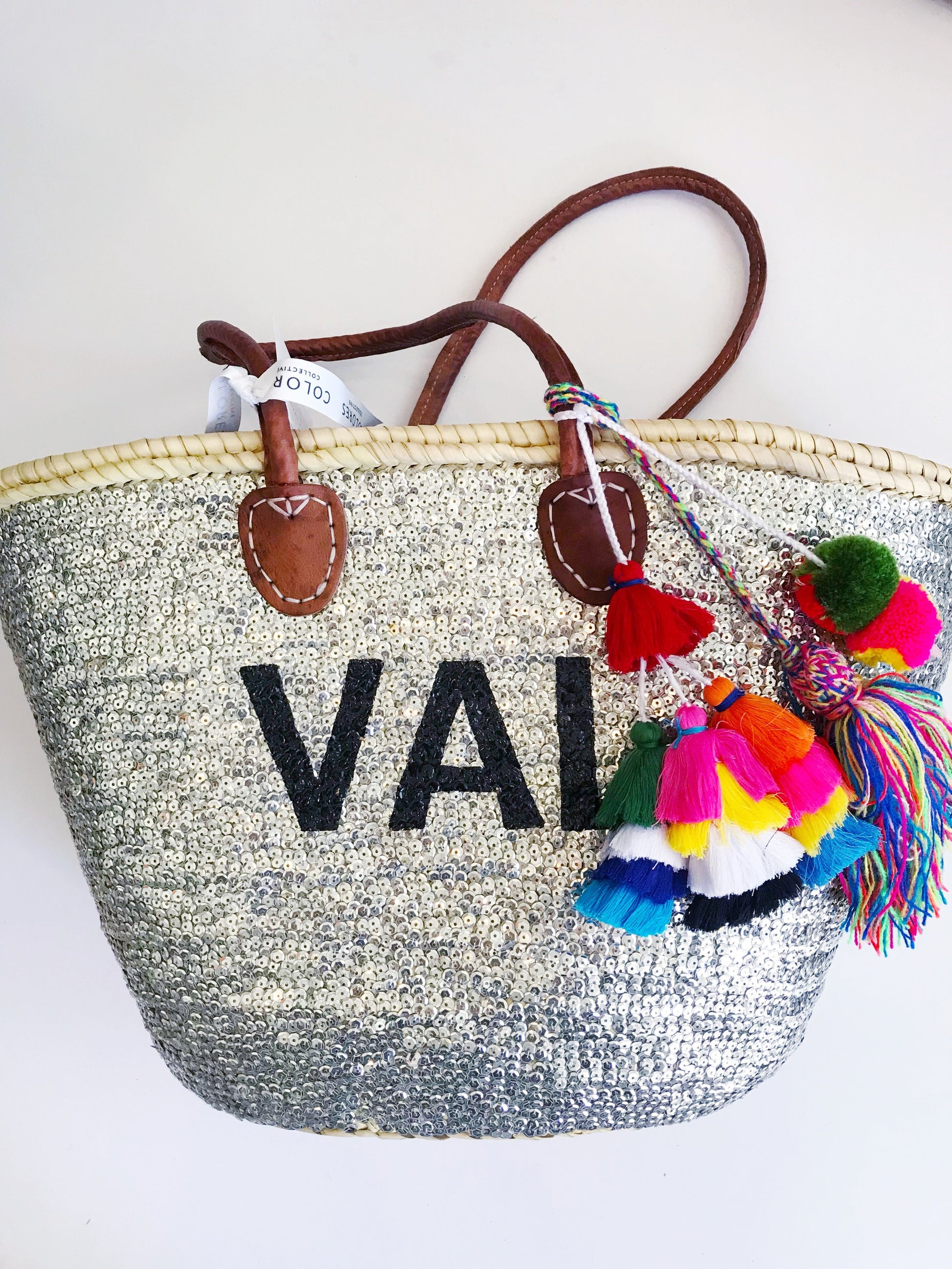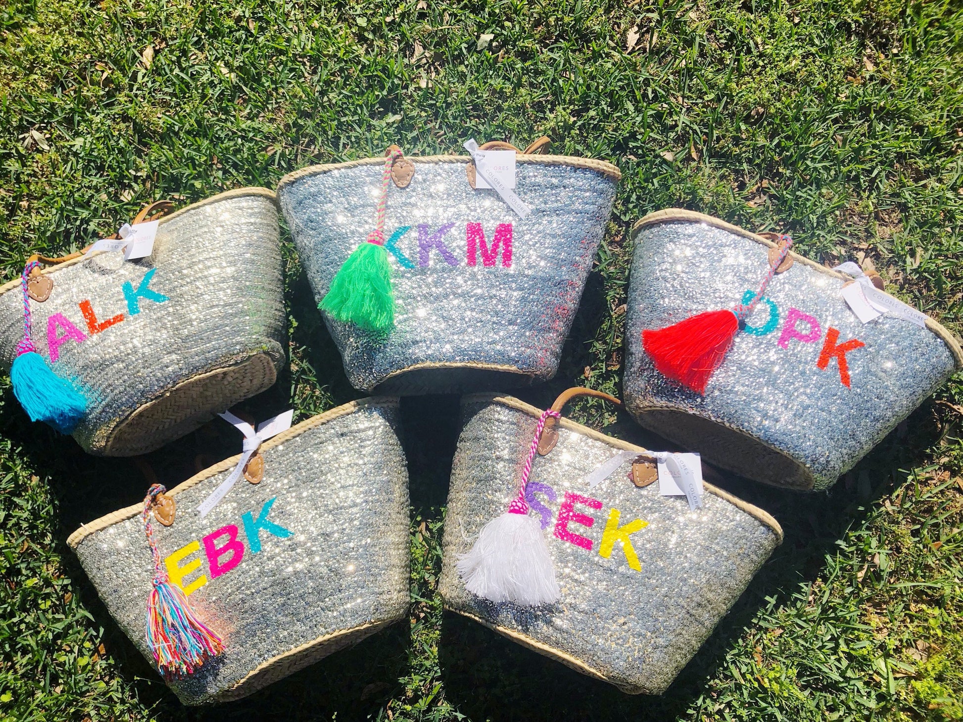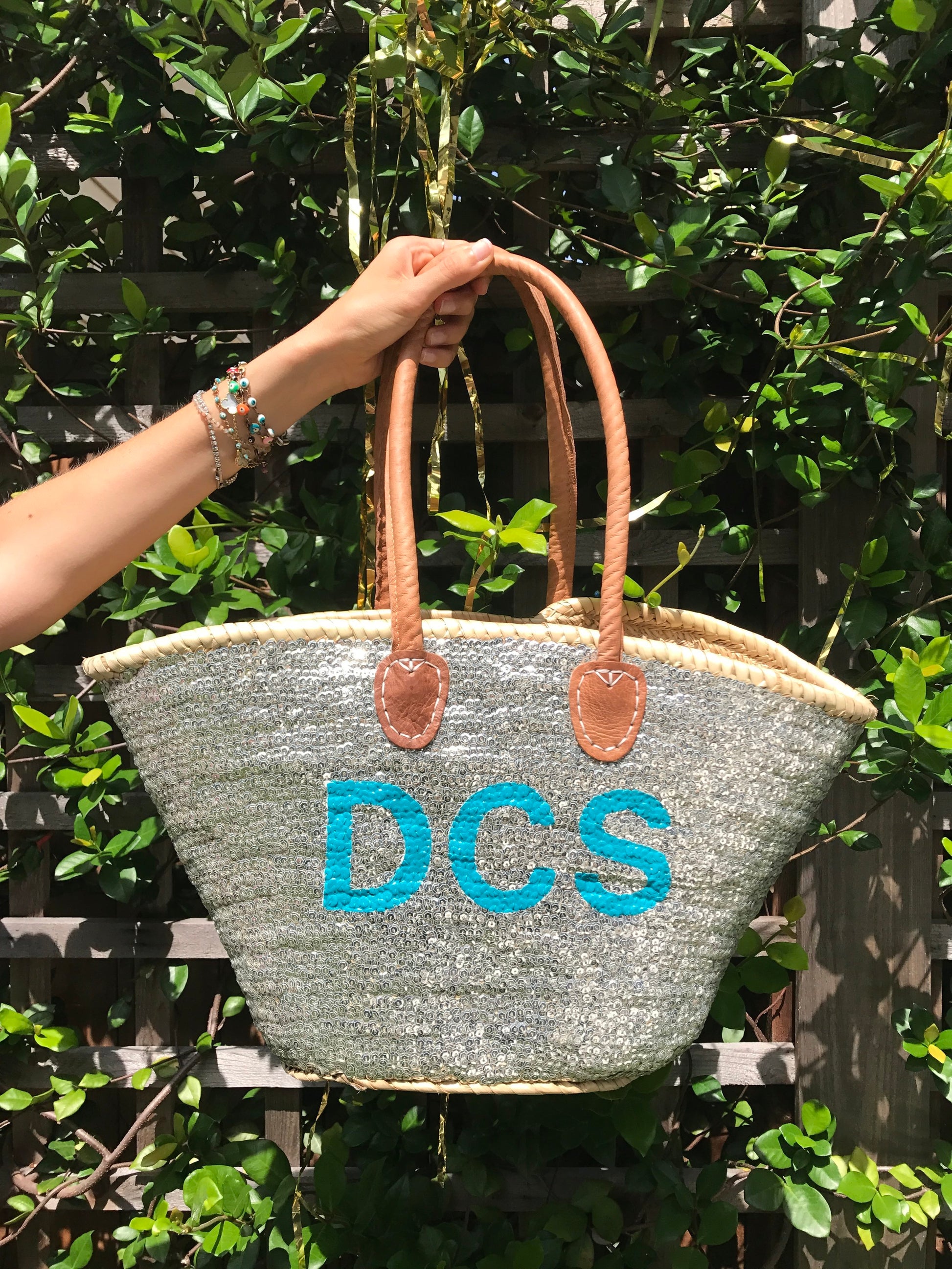 Handwoven straw totes from Morocco. Each bag covered in sequins that are individually sewn into the bag so they are secure. Medium length extra study light colored leather straps make for easy shoulder carrying.