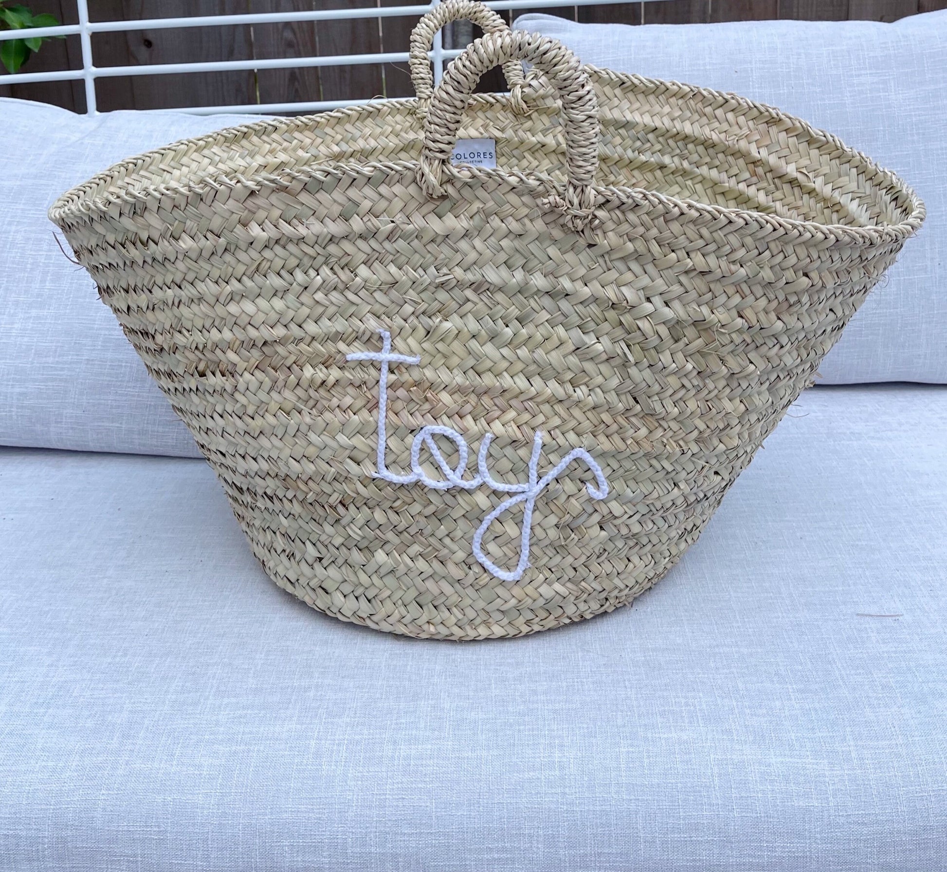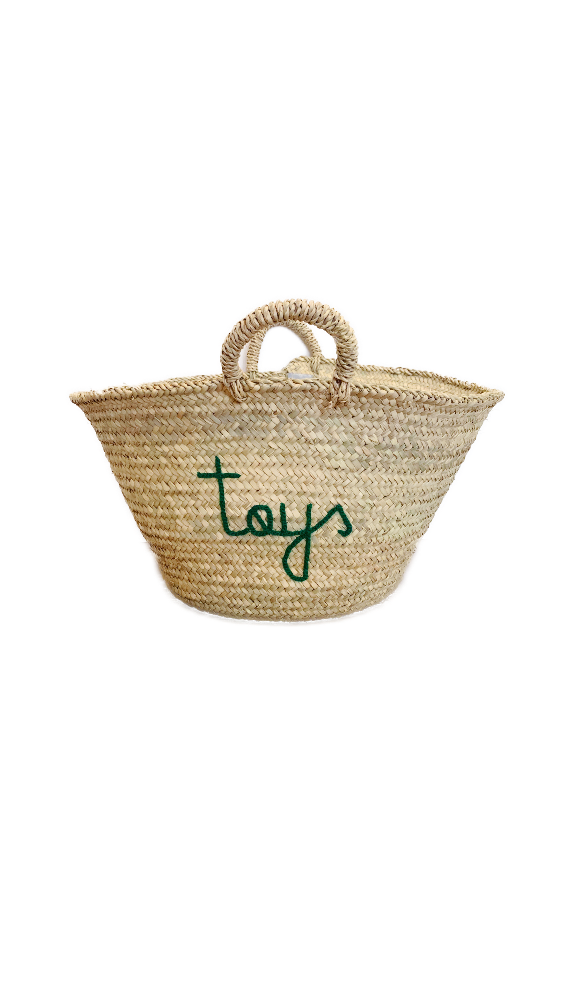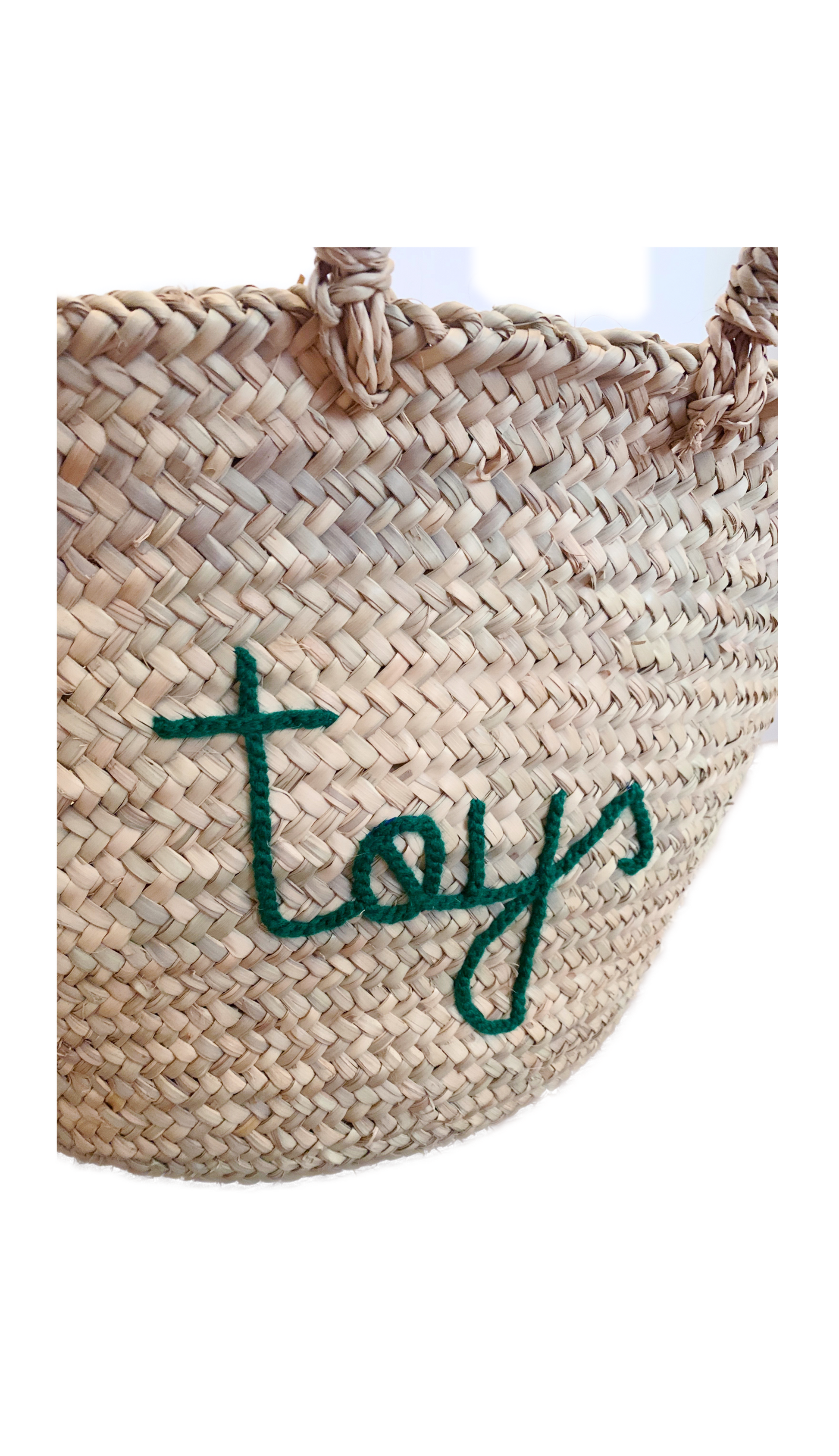 Word “toys” is hand embroidered with your choice of 4 thread colors; White, Light Pink, Green & Light Blue