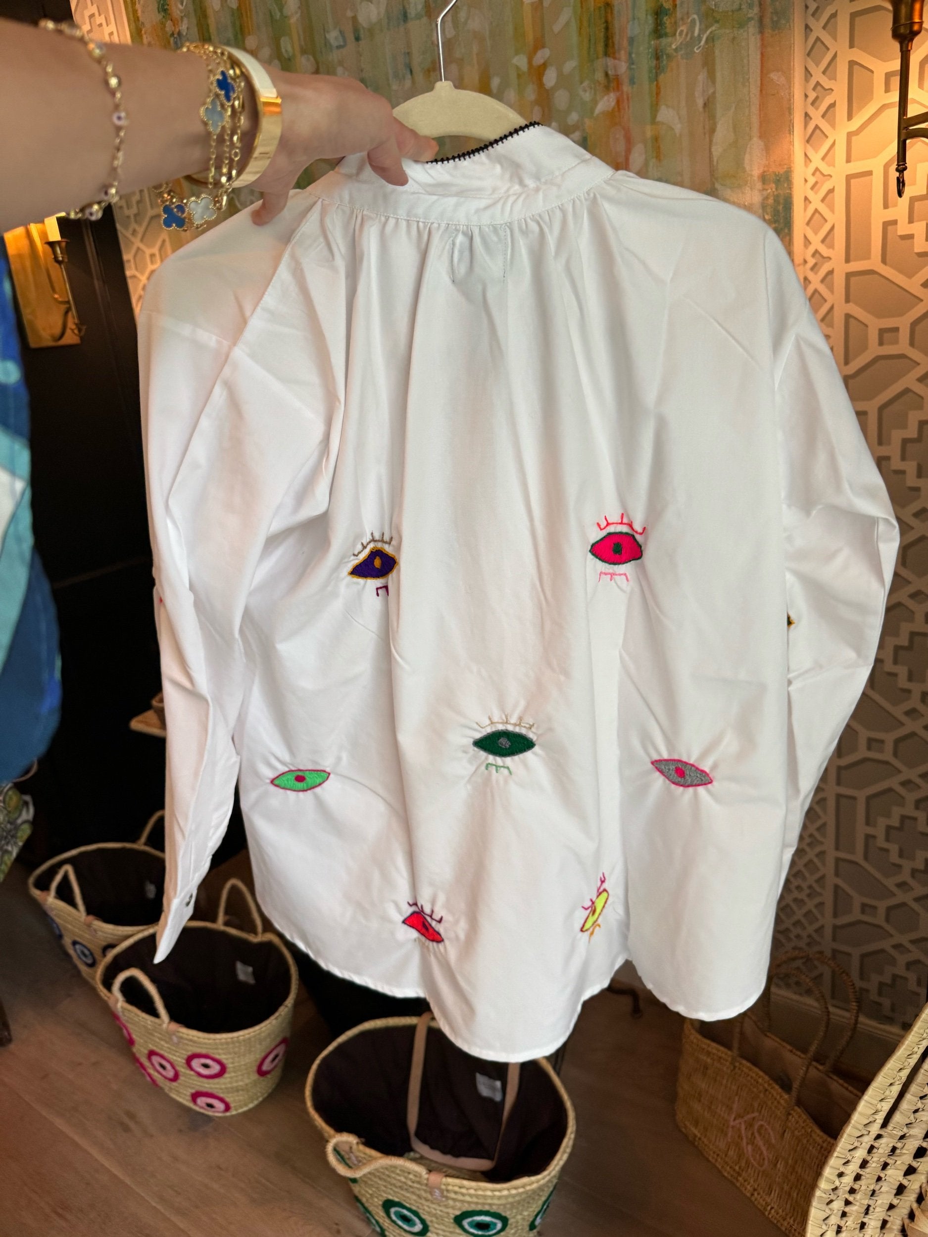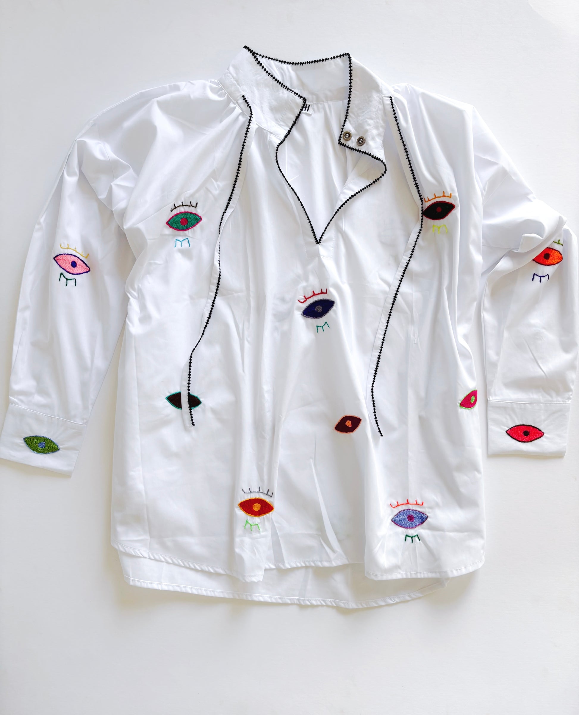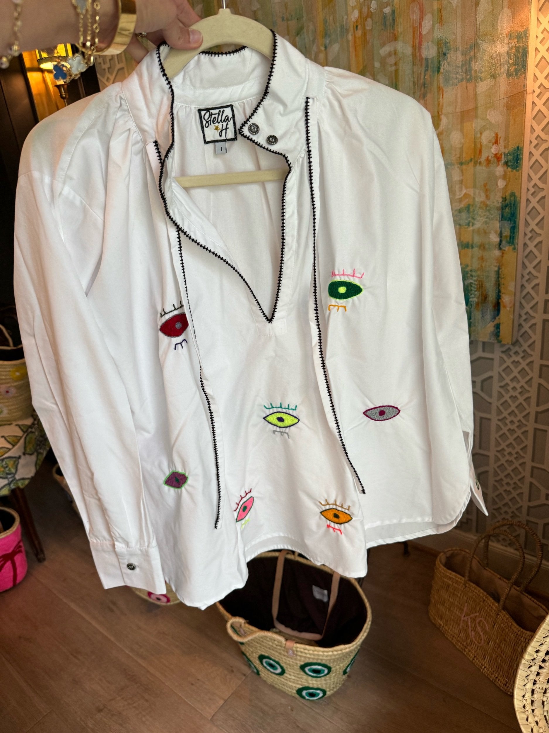 Each top features hand embroidered designs of various colored evil eyes around the front, sleeves and back, as well as specific black thread detailing about the neck line and ties.