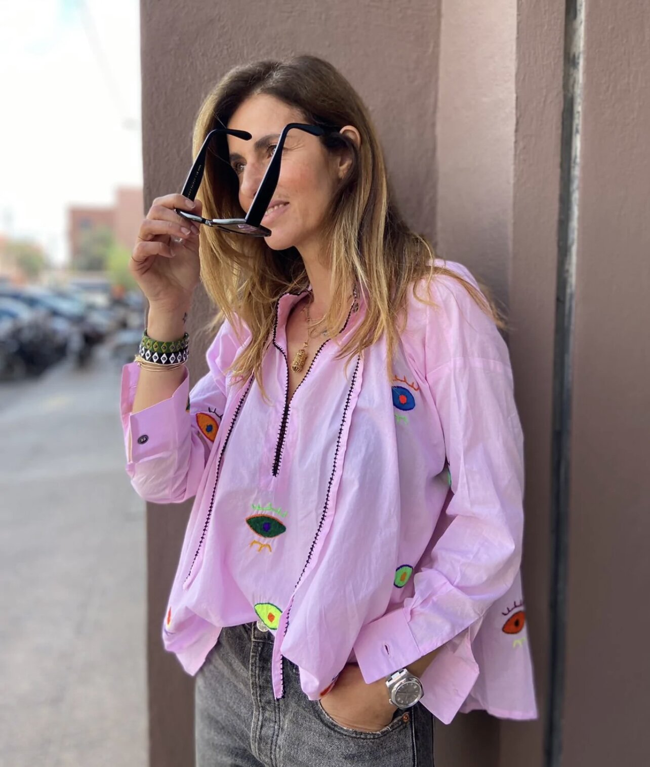 Soon to be the favorite piece in your wardrobe, this pink blouse with hand embroidered designs is the more comfortable, and flattering blouse for everyday wear.